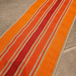 En färgglad löpare med ränder i brunt, svart, beigevit och orange Perfekt för att piffa upp ditt hem.