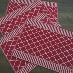 Unika bordstabletter i rött och ljusrosa med dekorativa ränder – handvävda i Sverige. Fint för att duka i jul.