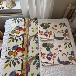 Två bordstabletter i rött med fransar. En med vita ränder och en med gröna ränder. 30 cm i diameter.