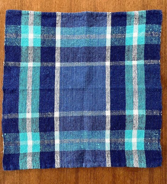 Mindre vävd duk/bordstablett i blått, turkos och vitt.