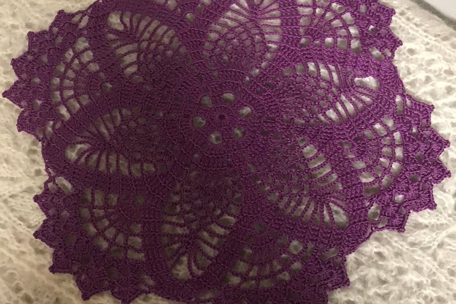 Virkad duk i lila färg med detaljerat mönster.