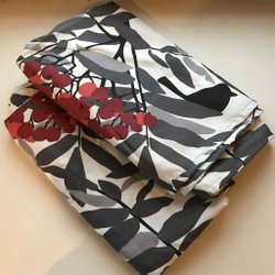 Ett par gardiner i blått tyg med tryck. Perfekt för att skapa en mysig atmosfär i hemmet.