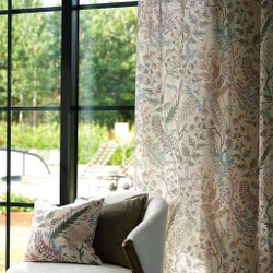 Ett charmigt tyg med ett retroinspirerat mönster. Tyget har ränder och dekorerats med rosetter och blommor. Gardinlängderna är 90cm breda och 220 cm långa, 2stlikadana, i fint skick.