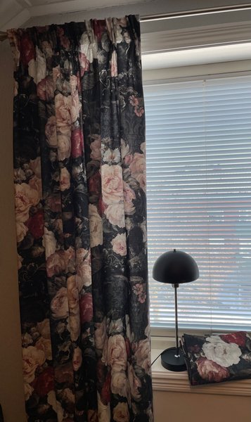 Gardinlängder med ett blommigt mönster i flera färger. Gardinen har veckband och är lämplig för gardinstång.