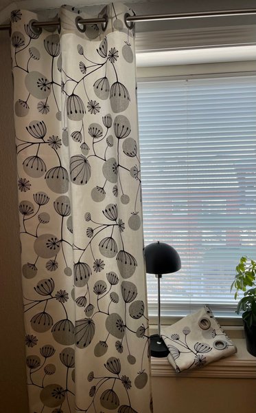 Dessa gardiner har ett mönster av stiliserade växter i svart och grått på en ljus bakgrund. De är försedda med öljetter för upphängning på gardinstång.