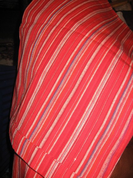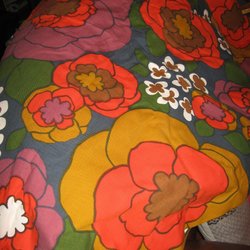 Ett livfullt randigt mönster i rött, vitt, orange och lila. Ränderna löper på längden och ger ett dynamiskt intryck. Tyget har en texturerad yta som bidrar till dess karaktär. Dessa är två gardiner, men du kan ju sy om dem till en folkdräktkjol, kuddar eller något annat. Det finns många möjligheter, bara fantasin sätter sina gränser.