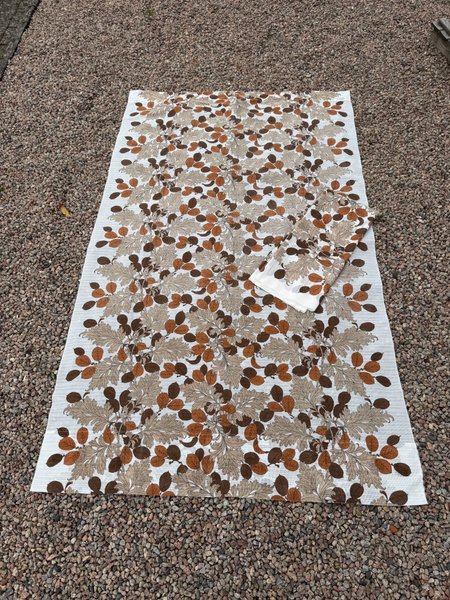 Gardiner med mönster av höstlöv i bruna och beigea nyanser. Duken har ett upprepat mönster över hela ytan.