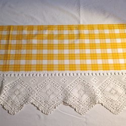 Gardinkappa röd med vi spetskant. Kanal för gardinstång. Mått: 182 x 44 cm.