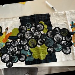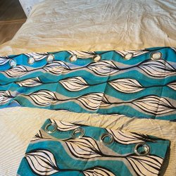Röd Gardinkappa med julmotiv. Det är fyra stycken de är bara fållade på en sida. Var o en är 125cm långa o 23cm breda.