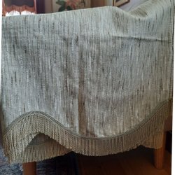 Retro gardinkappa i turkos, brun, orange, gul och vit. Tyget är lite noppigt samt något blekt.