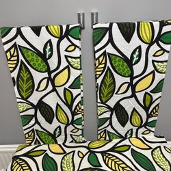 2 mönstrade panelgardiner och 2 gröna panelgardiner. Dessa har hängt tillsammans. Längd 208 cm och 43cm bredd.