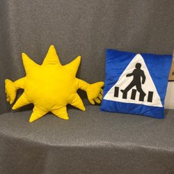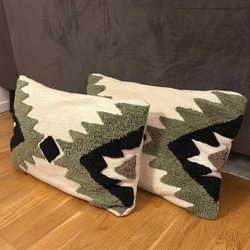 Ett set med olika kuddar i varierande färger och mönster. Perfekt för barnrummet eller som dekorativa inslag i hemmet. Mysiga att leka med, till exempel i tält. Bra skicka men pytte litet fläck av färg på ena. Kan även köpas en och en eller kombineras som man önskar.