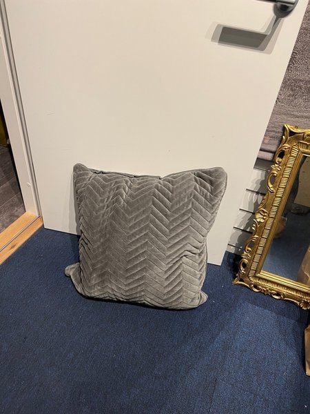 En grå kudde med ett snyggt mönster som passar bra i soffan eller sängen.