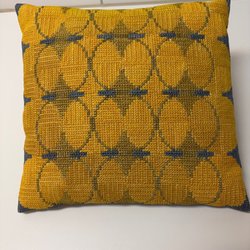 Mjuk kudde med unikt gult och beiget mönster framtill av bomull och grå sammet baktill. Fodral och kudde ingår.