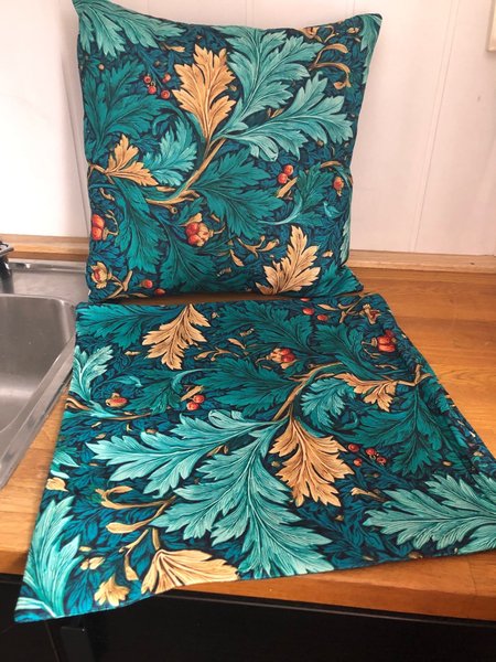 2 st helt nya Kuddfodral med ett detaljerat mönster av blad i nyanser av turkos, petrolblå, guld och rött. Baksidan är likadant mönstrat. Mönstret är inspirerat av naturen och ger en färgklick i hemmet. Mjuka och sköna.