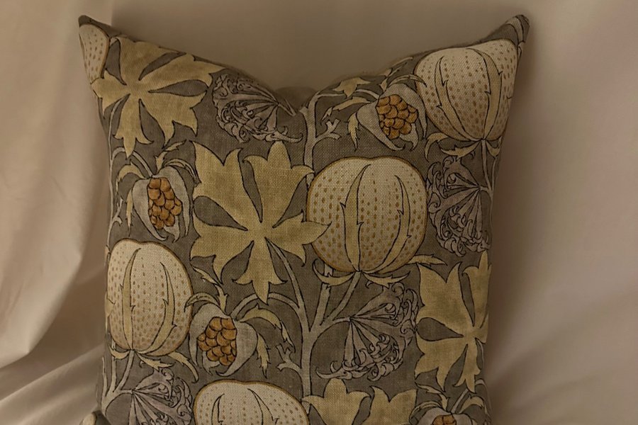 Kuddfodral i st. 40x40cm i tyg Pumkins/ GP & J Baker från Svenskt Tenn med naturfärgat linnetyg på baksidan, overlockade kanter samt blixtlås i nederkant.