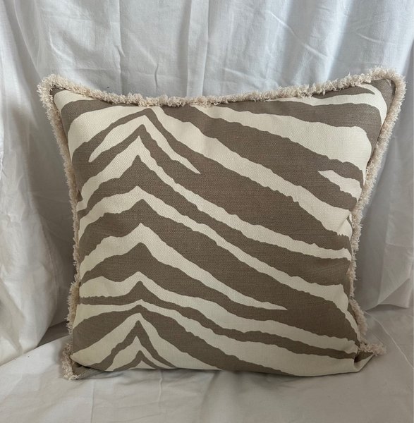 Kuddfodral i st. 50x50 cm i tyg Zebra från Lauritzon med naturfärgat linnetyg på baksidan samt frans runtom, overlockade kanter samt blixtlås i nederkant.