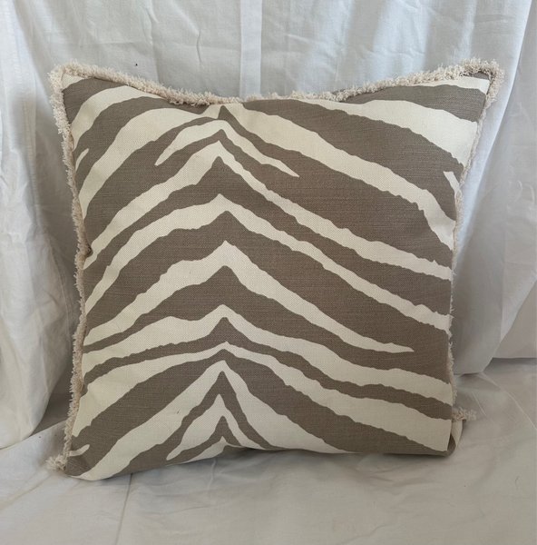 Kuddfodral i st. 50x50 cm i tyg Zebra från Lauritzon med naturfärgat linnetyg på baksidan samt frans runtom, overlockade kanter samt blixtlås i nederkant.