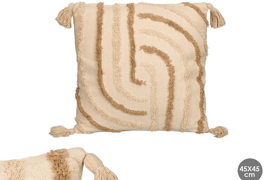 Dekorativ kudde i storlek 47x47 cm med tofsar i hörnen och ett mönster av beiga linjer.