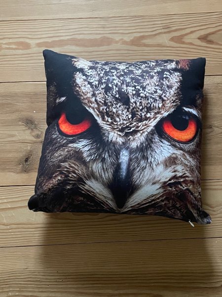 Dekorativ kudde med ett tryck av en uggla. Perfekt för soffan eller sängen. 38 x 38 cm