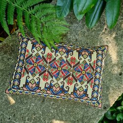 En vacker, handbroderad kudde med ett unikt mönster i gröna och bruna toner. Perfekt som en dekorativ detalj i soffan eller sängen. Baksidan är enfärgad grön. Broderad i tvistsömn av yllegarn