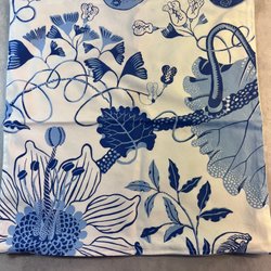 Kuddfodral med dragkedja. Mönster med blad i grått och vitt. Framsida sydd med tyg från Svenskt tenn. Baksida vitt lin.