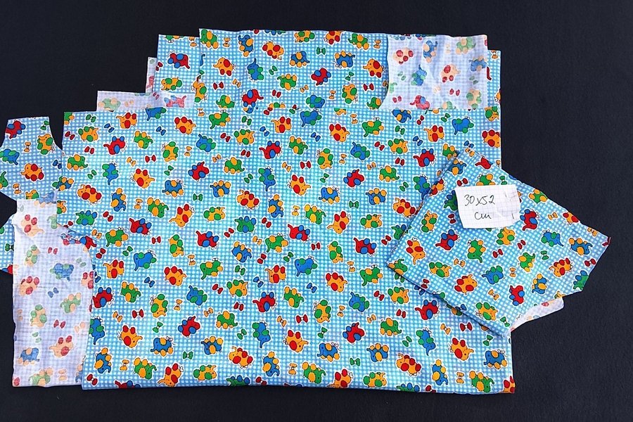Stuvbit av tunn trikå. en del bortklippt i övrigt oanvänt. Biten är ca 76 x 140 cm och det medföljer en extra bit på ca 30 x 52 cm.