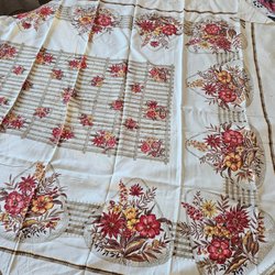 Mönstret är spritt över hela tyget. Tyget är tunt och släpper igenom ljus. Vet ej material, men det är väldigt mjukt.