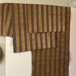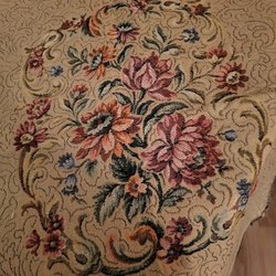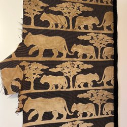 Möbeltyg i mörkblå färg med små prickar i olika färger. Man har klippt bort en smal bit, ca 10 cm x 80 cm, i ena hörnet. Mått: 2.00 x 1.35 meter samt 0.80 x 1.15 meter