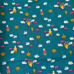 Grönt tyg med ett mönster av golfspelare, golfklubbor, golfbagar och flaggor. Syntet. 158 cm brett och167 cm långt.