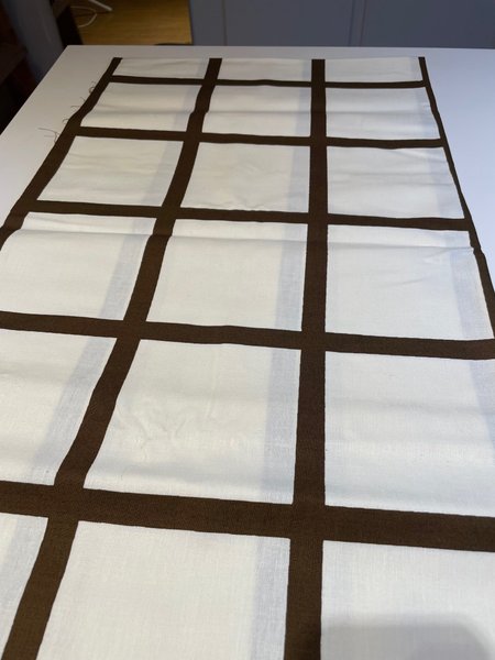 Vitt/brunt bomullstyg 150 x 150 cm rutor 11,5 cm de bruna ränderna 1,5 cm.