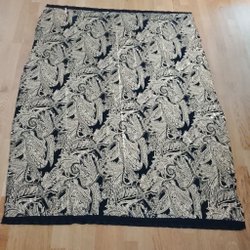Vackert orientaliskt tyg i djupblå nyans med dekorativt mönster i guldtoner längs ena kanten. Mönstret består av blommor och slingor som ger en elegant och exklusiv känsla. Tyget mäter 191 × 112 cm och är välbevarat – passar utmärkt till inredning, sömnad eller som dekorativ textil.