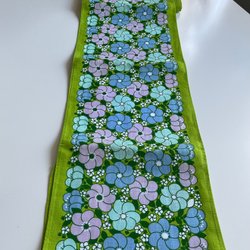 Grönt tyg med ett mönster av golfspelare, golfklubbor, golfbagar och flaggor. Syntet. 158 cm brett och167 cm långt.