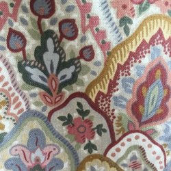 Färgglatt tyg i bomull med retro mönster med en aning flossad rätsida. Perfekt för sömnadsprojekt eller som en dekorativ väggbonad. 1,95 m, bredd 140 cm. Vikt 703 gram.