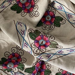 Pläden är i fint använt skick, det finns några små fläckar på den ena sidan samt lite sömsläpp i hörnen. Lite ovanligare färgkombination, lila, svart, grått och vitt.