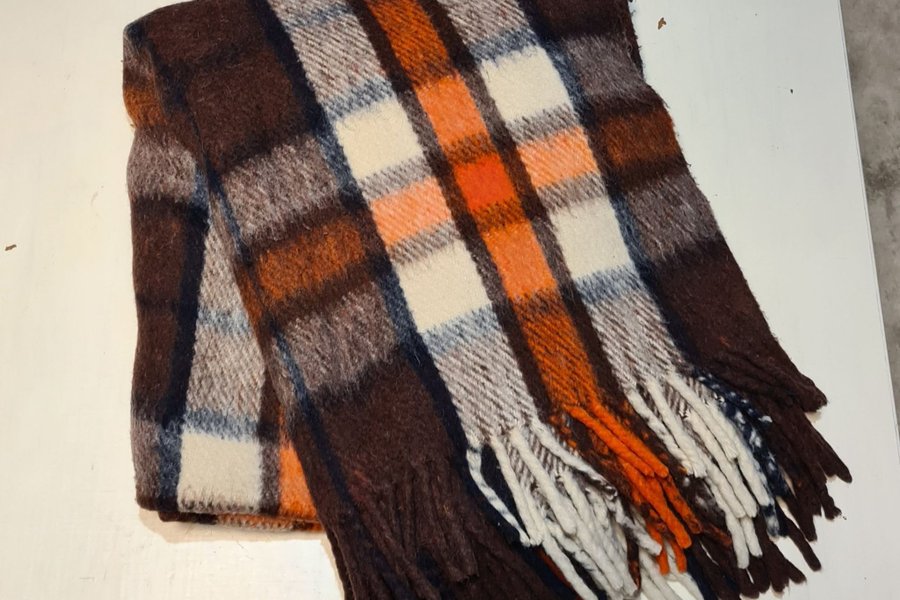 En filt med ett klassiskt rutmönster i färgerna brunt, orange och vitt. Filten har fransar.