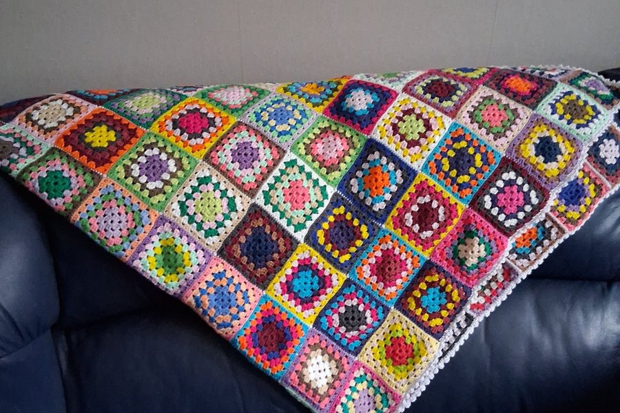 Färgglad virkad pläd i mormorsrutor. Perfekt för att ge färg till rummet.