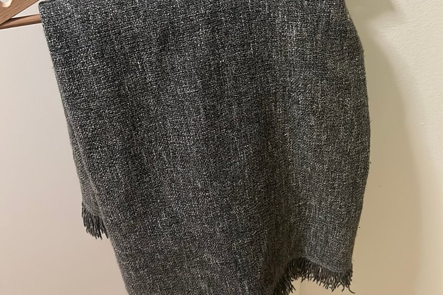 En mörkgrå filt med fransar längs kanterna. Filten har en texturerad yta och är vikt över en trägalge.