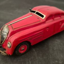 En rosa leksaksbrandbil i plast med en brandman vid ratten. Tillverkad av Tomte Toys, Stavanger, Norway.Tyvärr saknar brandmannen baktill sitt huvud!
