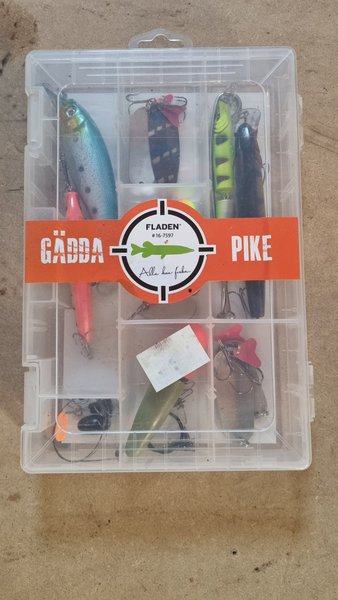 Set med olika typer av beten för gäddfiske. Innehåller flera beten i olika färger och former, alla organiserade i en praktisk låda. Lämplig för både nybörjare och erfarna fiskare.