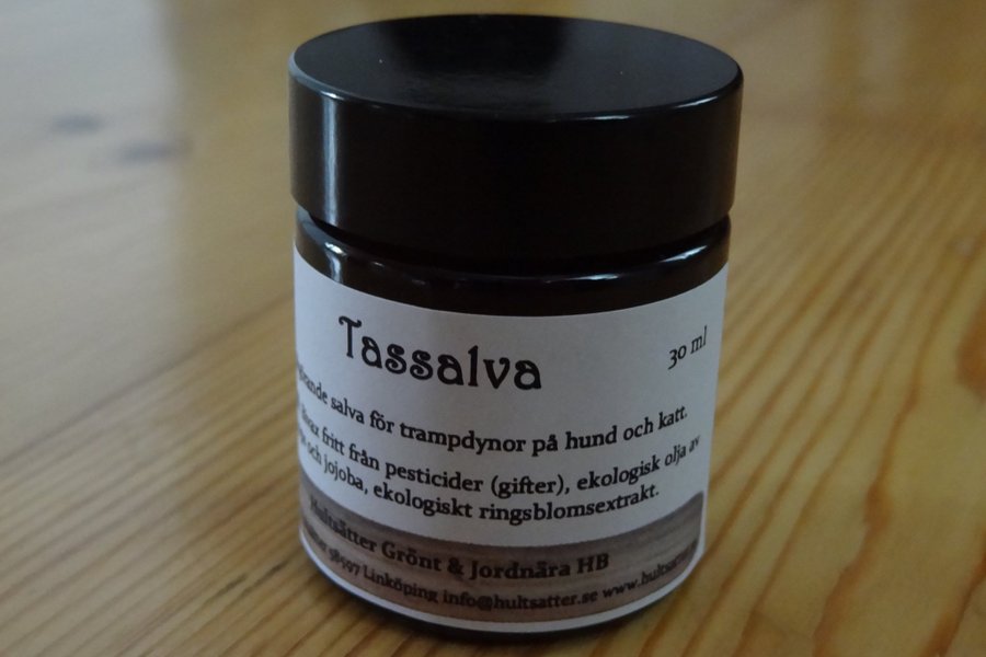 En uppmjukande och skyddande tassalva för att smörja in trampdynorna på hundar och katter.