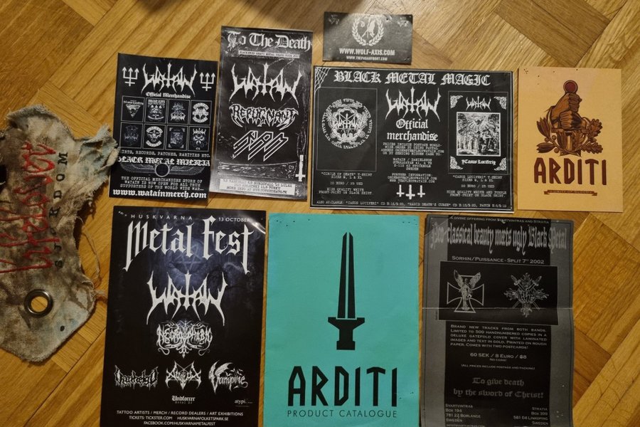 En samling papper med anknytning till olika band och evenemang. Inkluderar flyers, vykort m m... Arditi, Lifelover, Watain...