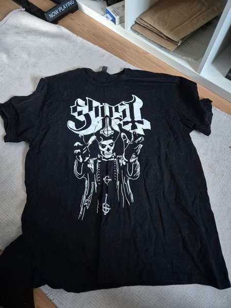 Svart t-shirt med tryck av Ghost-logotypen och Papa Emeritus II. T-shirten har korta ärmar och en rund halsringning.
