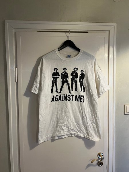 Vit t-shirt med ett tryck av bandet Against Me! på framsidan. Trycket föreställer fyra personer i cowboy-liknande kläder.