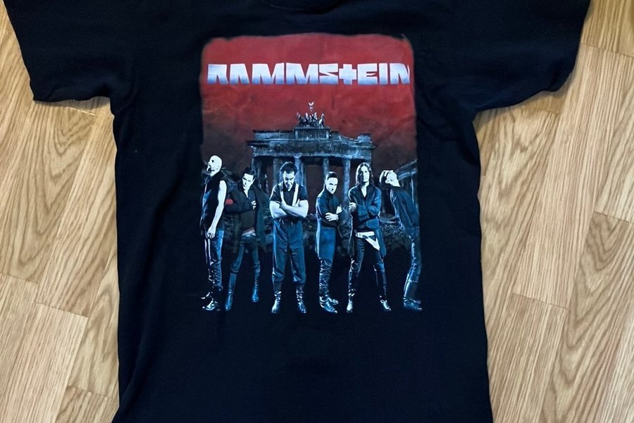 Svart t-shirt med tryck av bandet Rammstein framför Brandenburger Tor.