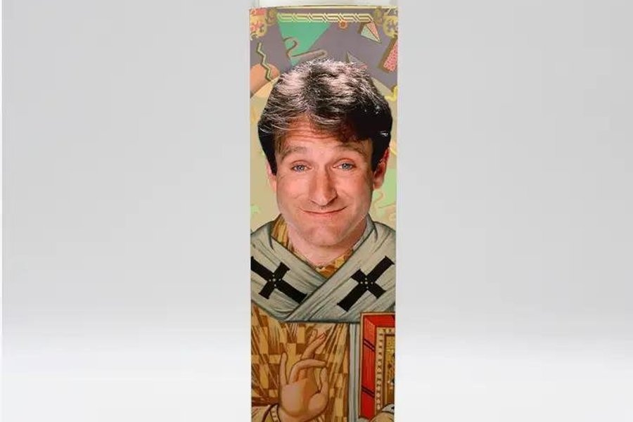 Stearinljus i glasbehållare med Robin Williamsmotiv.