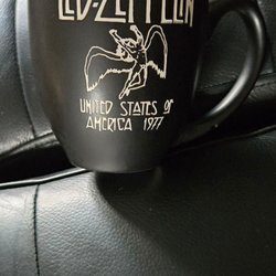 Säljer en Led Zeppelin mugg med motiv från deras turné i USA 1977. Muggen är svart med vit text och bild.