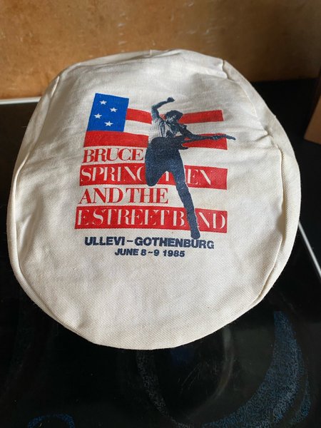 Vit keps med tryck av Bruce Springsteen and The E Street Band, Ullevi-Gothenburg June 8-9 1985.