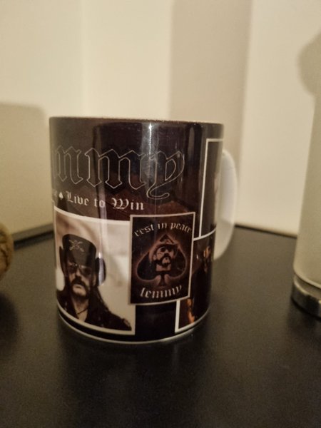 Mugg med Motörhead-tema och bilder på Lemmy Kilmister. Texten "Live to Win" och "Rest in Peace Lemmy" finns också på muggen.