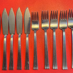 Bestick i metall. Gense Thebe. 11 st. skedar längd 18 cm, 12 st. knivar 19,5 cm och 12 st. gafflar 19 cm.